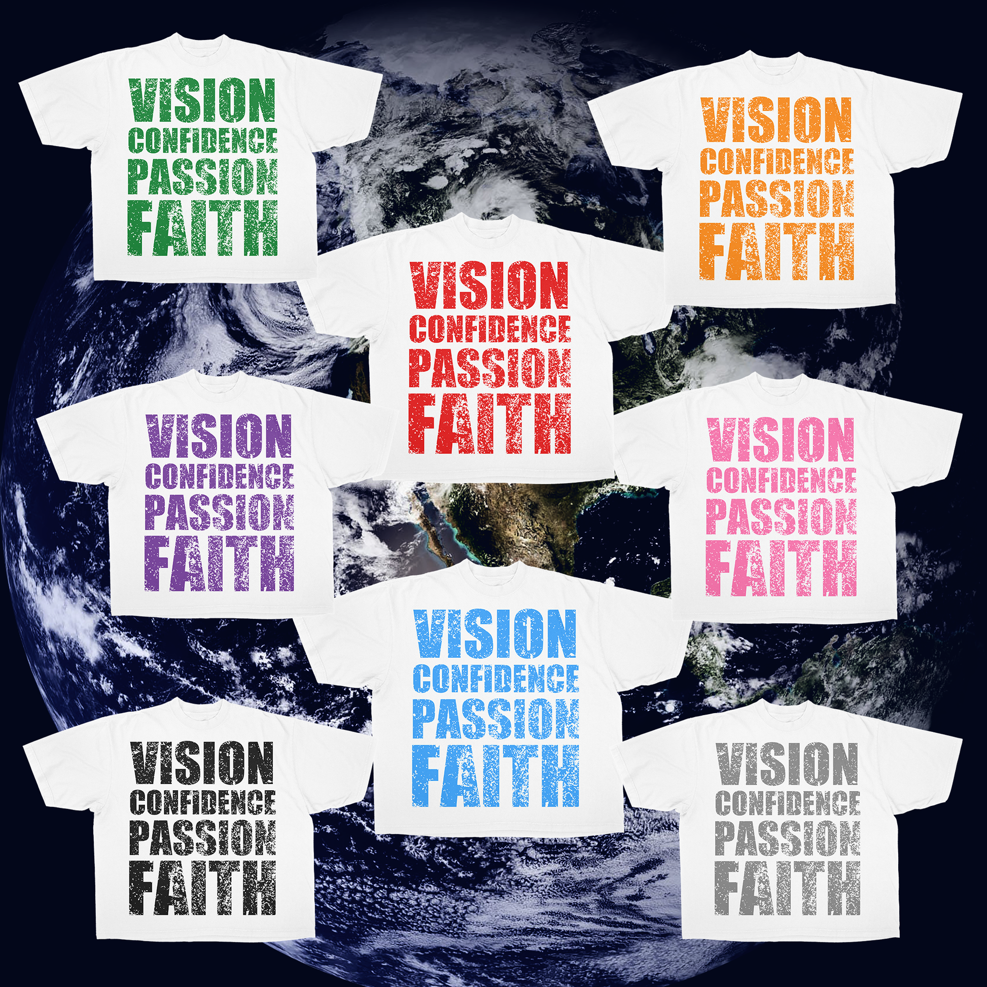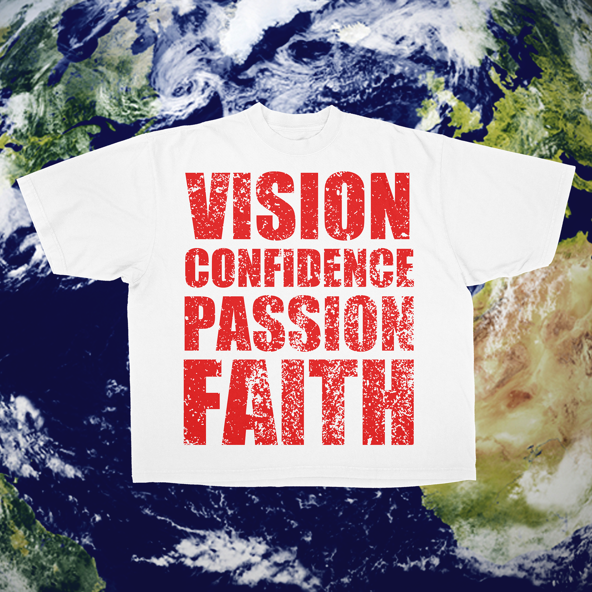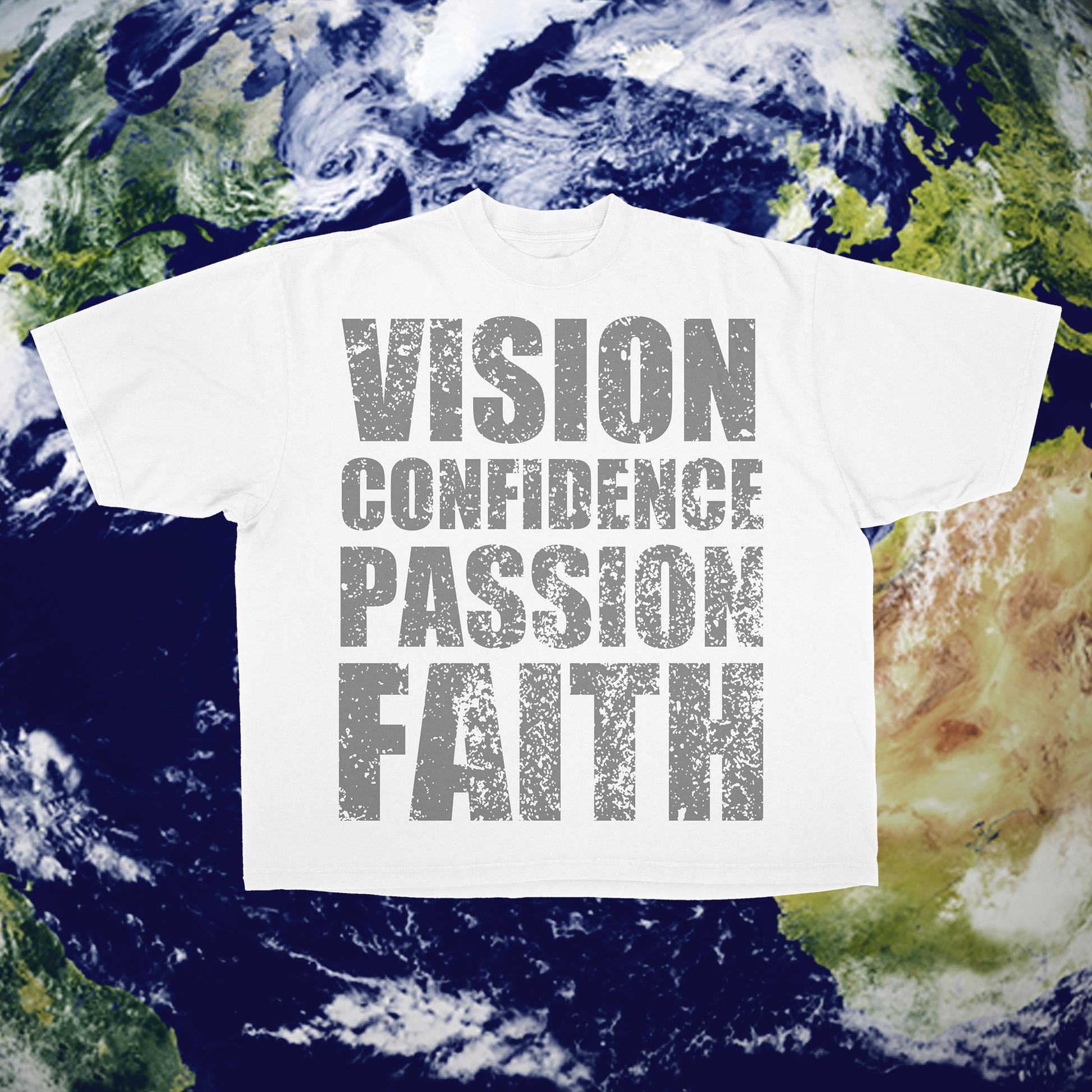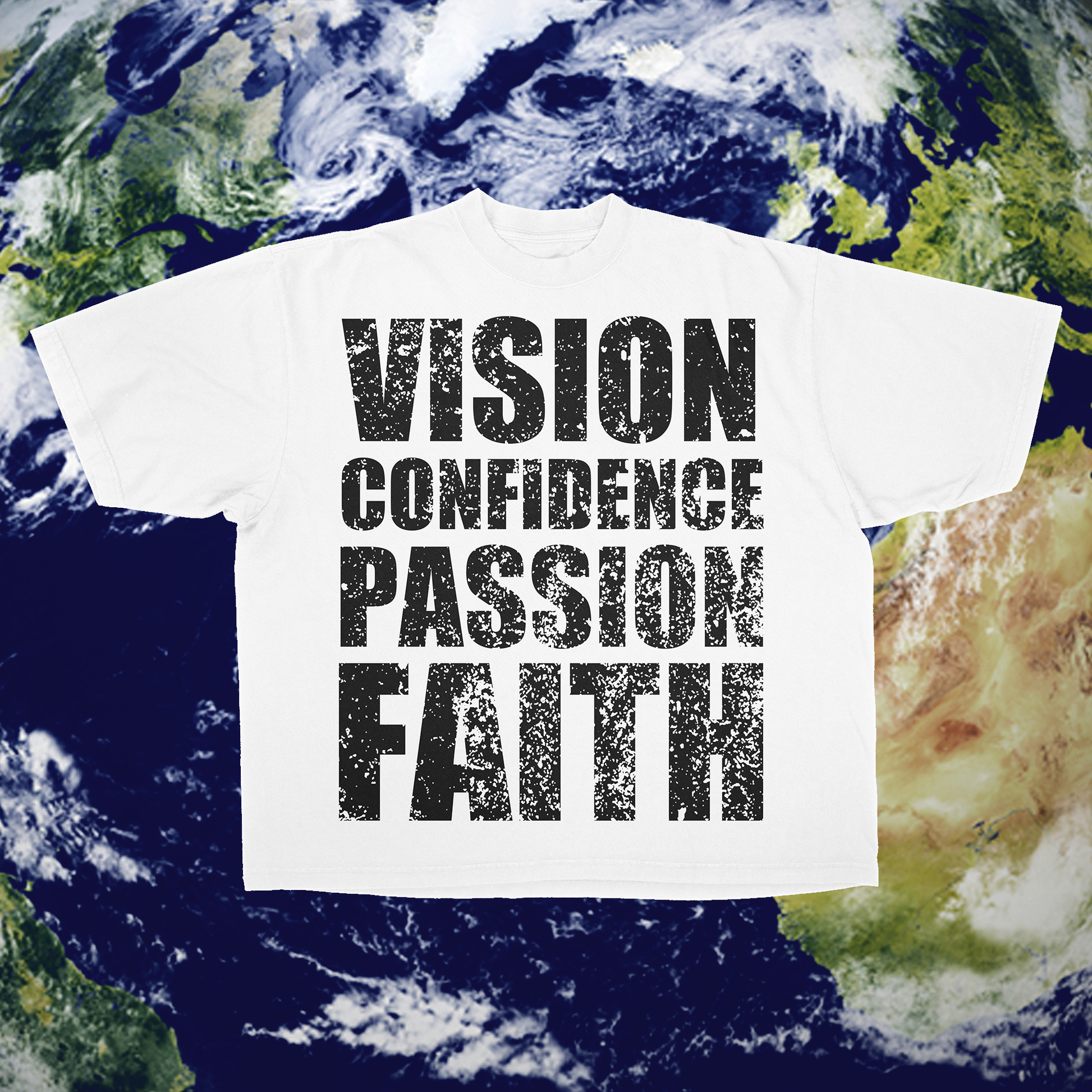 This shirt represents the mindset of dreamers, doers, and believers. VISION to see the goal, CONFIDENCE to take the first step, PASSION to fuel the journey, and FAITH to keep going no matter the obstacles.
